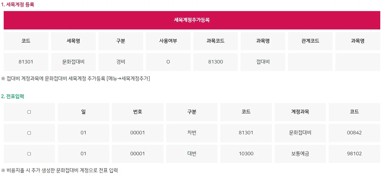 접대비 비용처리를 하려면 문화접대비 입력 방법을 숙지하고, 지출 증빙 서류를 준비해야 합니다. 문화접대비 입력 방법은 세목 계정 등록 후 전표 입력을 통해 이루어집니다. 세목 계정추가등록 코드는 81301, 세목명은 문화접대비, 구분은 경비, 사용 여부 O, 과목 코드 81300, 과목명은 접대비로 기입됩니다. 그 후 비용지출 시 추가 생성한 문화접대비 계정으로 전표를 입력하면 끝입니다.