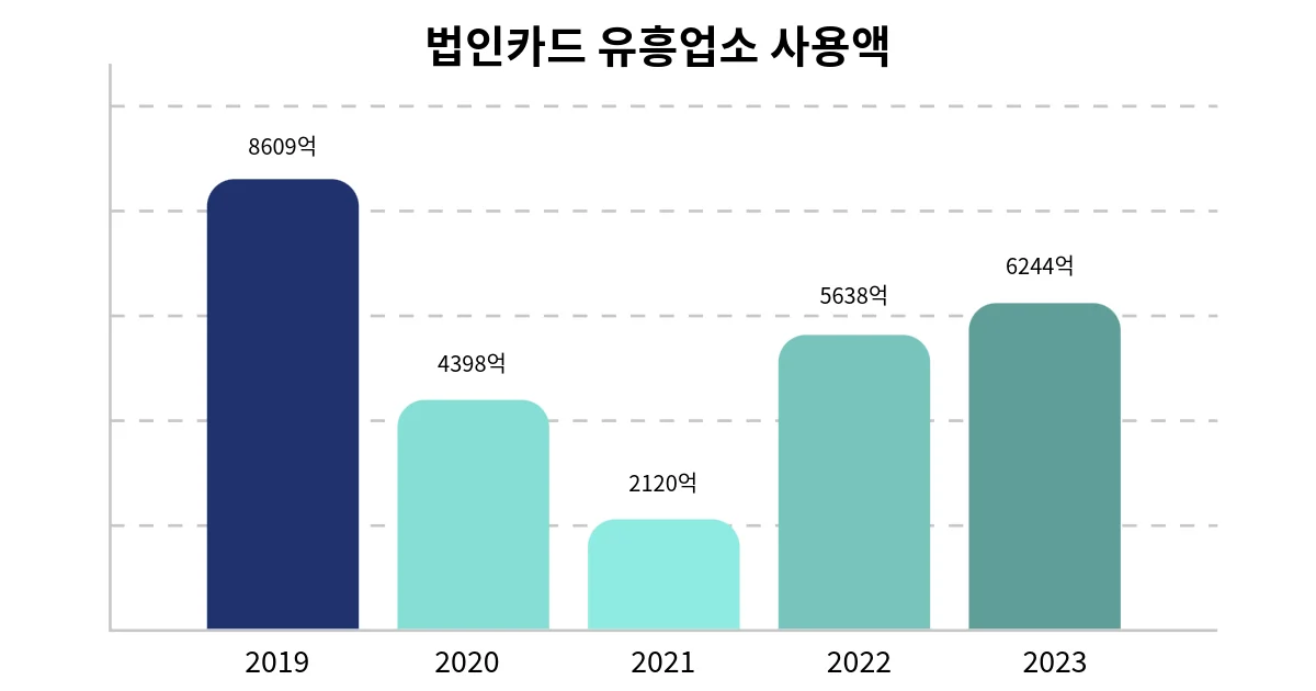 그중 법인카드의 유흥업소 사용액이 점차 증가하고 있습니다. 2023년 유흥업소 사용액은 전년(5638억 원) 보다 606억 원 늘어난 6244억 원입니다. 이는 2023년 전체 법인카드 사용액(176조 5627억 원)의 0.4%에 해당하는 수치입니다. 법인카드 유흥업소 사용액은 2010년대 초반만 해도 1조 원을 초과했으나, 이후 점차 감소하기 시작했습니다. 특히 코로나 19의 여파로 2019년에는 2120억 원까지 감소했으나 이후 다시 증가하기 시작했습니다.