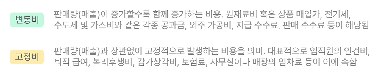 변동비: 판매량(매출)이 증가할수록 함께 증가하는 비용을 뜻합니다. 원재료비 혹은 상품 매입가, 전기세, 수도세 및 가스비와 같은 각종 공과금, 외주 가공비, 지급 수수료, 판매 수수료 등이 해당할 수 있습니다.